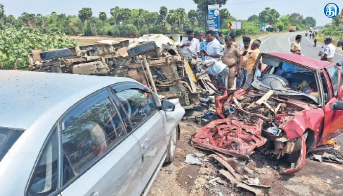 காரில் வந்த செந்தமிழ் செல்வன், அருணா, மினிவேனில் வந்த புதுக்கோட்டை மாவட்டம் இலுப்பூர் விளாம்பட்டியை சேர்ந்த சுதாகர் (45) ஆகியோர் சம்பவ இடத்திலேயே உயிரிழந்தனர். ரம்யா, 2 குழந்தைகள், மினி வேன் டிரைவர் மூர்த்தி ஆகிய 4 பேர் படுகாயத்துடன் புதுக்கோட்டை அரசு மருத்துவக்கல்லூரி மருத்துவமனையில் சேர்க்கப்பட்டனர். அங்கு சிகிச்சை பலனின்றி ரம்யா உயிரிழந்தார். 2 குழந்தைகள், மினி வேன் டிரைவர் மூர்த்தி ஆகியோர் சிகிச்சை பெற்று வருகின்றனர். இதுகுறித்து நமணசமுத்திரம் போலீசார் வழக்கு பதிந்து விசாரிக்கின்றனர்.