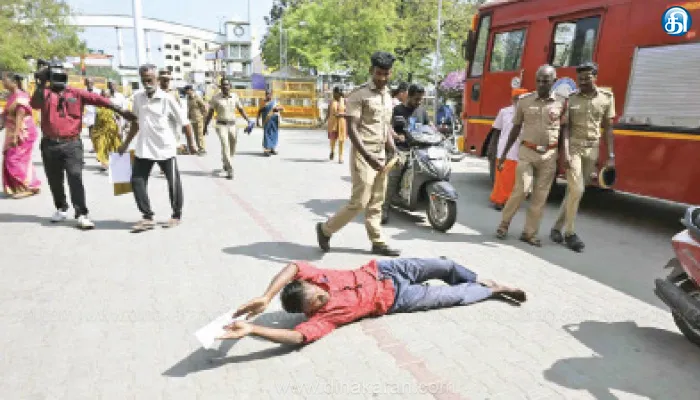 ஈரோடு : கலெக்டர் அலுவலகத்தில் வாராந்திர மக்கள் குறைதீர்க்கும் நாள் கூட்டம் நடைபெற்றது. இதில், மனு அளிக்க வந்திருந்த நபர் ஒருவர், கலெக்டர் அலுவலக வளாகத்தில் திடீரென படுத்து உருள தொடங்கினார்.அப்போது, அங்கு பாதுகாப்பு பணியில் இருந்த போலீசார் விரைந்து வந்து உடனடியாக அவரை மீட்டு, குறைதீர் கூட்ட அரங்குக்கு அழைத்து சென்று மனு அளிக்க வைத்தனர்.