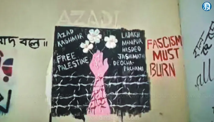 பல்கலைக்கழகத்தின் 3வது கேட் அருகே உள்ள சுவரில் வரையப்பட்ட மேற்கண்ட வாசகங்கள் எழுதப்பட்டிருந்தன. இந்த வாசகங்களை எழுதிவைத்த நபர்களை அடையாளம் காணும் வகையில், அப்பகுதியில் இருக்கும் சிசிடிவி காட்சிகள் மற்றும் பிற ஆதாரங்களை போலீசார் ஆய்வு செய்து வருகின்றனர்.