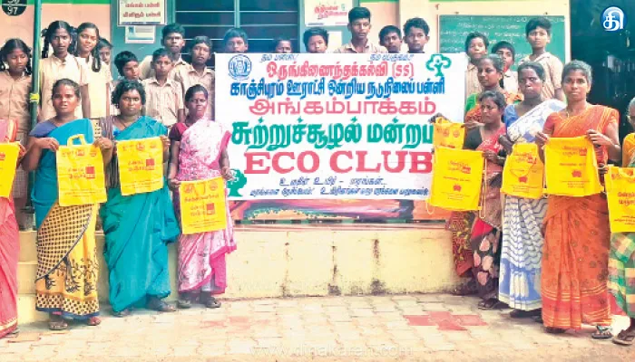 மேலும், தமிழக அரசு சார்பில் மீண்டும் ‘‘மஞ்சள் பை’’ திட்டத்தை தமிழக முதல்வர் மு.க.ஸ்டாலின் தொடங்கி வைத்தார். கடைகளுக்கு செல்லும்போது வீட்டில் இருந்து பைகளை கொண்டு செல்ல வேண்டும், என்றும் அரசு சார்பில் பொதுமக்களுக்கு அறிவுறுத்தப்பட்டது. இதையடுத்து, பொதுமக்கள் மஞ்சள் பைகளை வெகுவாக பயன்படுத்தி வருகின்றனர். இந்நிலையில், காஞ்சிபுரம் ஊராட்சி ஒன்றியம் அங்கம்பாக்கத்தில் நடுநிலைப்பள்ளியில் செயல்பட்டு வருகிறது.