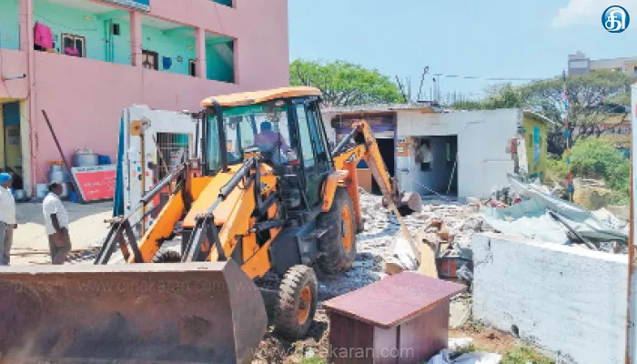 அந்த கோரிக்கை சம்பந்தப்பட்ட வருவாய்த்துறை, பொதுப்பணித்துறைக்கு புகார் கடிதமாக அனுப்பப்பட்டது. அதன்பேரில் இரண்டு துறை அதிகாரிகளும் கலந்து ஆலோசித்து முதலில் கடைகளை மட்டும் எடுக்க 15 நாள் கால அவகாசம் கொடுக்கப்பட்டு, ஏழு கடைகளுக்கும் நோட்டீஸ் தரப்பட்டது குறிப்பிடத்தக்கது. இந்தநிலையில் அந்த கால அவகாசம் நேற்று முன்தினம் முடிவுற்றது. இதை அறிந்த சம்பந்தப்பட்ட துறை அதிகாரிகள், டிஎஸ்பி ஜெயஸ்ரீ மற்றும் இன்ஸ்பெக்டர் வடிவேல் முருகன் தலைமையிலான 50க்கும் மேற்பட்ட போலீசாருடன் நேற்று ஜேசிபி இயந்திரங்கள் மூலம் இடிக்க முற்பட்டனர்.
