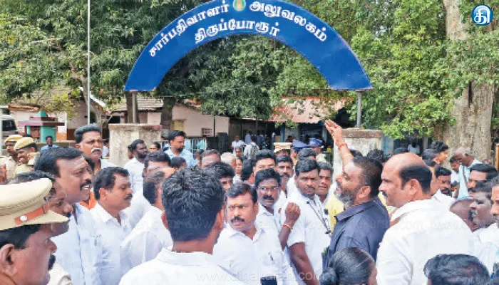 விடுதலை சிறுத்தைகள் கட்சியின் செய்தி தொடர்பாளர் வேதா அருள், தமிழக வெற்றிக்கழக ஒன்றிய செயலாளர் கவுதம், புரட்சி பாரதம் நிர்வாகிகள் ராஜேஷ், அலெக்சாண்டர் மற்றும் பல்வேறு கட்சியினர் திருப்போரூர் சார்பதிவாளர் அலுவலகத்தை முற்றுகையிட்டனர். அப்போது, அனைத்துக் கட்சியினரிடம் போலீசார் பேச்சு வார்த்தை நடத்தினர். அப்போது, அனைத்துக் கட்சியினரும் சார்பதிவாளரை சந்தித்து மனு அளிப்பதாக தெரிவித்தனர். இதற்கு, போலீசார் அனுமதி வழங்கினர்.