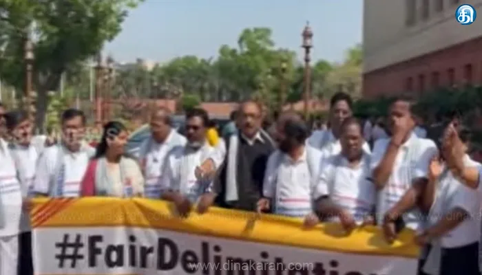 டெல்லி: ஒன்றிய அரசை கண்டித்து நாடாளுமன்ற வளாகத்தில் தமிழ்நாட்டு எம்.பி.க்கள் 2வது நாளாக போராட்டம் நடத்தி வருகின்றனர். தொகுதி மறுசீரமைப்பு குறித்து விவாதம் நடத்த ஒன்றிய அரசு அனுமதி மறுப்பதை கண்டித்து போராட்டம் நடைபெற்று வருகிறது. அதில் திமுக, மதிமுக, விசிக, காங்கிரஸ், கம்யூனிஸ்ட் கட்சி எம்.பி.க்கள் போராட்டத்தில் பங்கேற்றுள்ளனர். குறைக்காதே குறைக்காதே தொகுதிகளை குறைக்காதே என்று எம்.பி.க்கள் முழக்கம் எழுப்பி வருகின்றனர்.