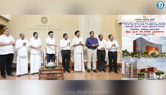 சென்னை: கடந்தாண்டு தமிழக சட்டப்பேரவையில் விதி எண் 110-ன் கீழ் திருச்சி மாவட்டத்தில் உலகத்தரம் வாய்ந்த மாபெரும் நூலகம் மற்றும் அறிவுசார் மையம் கலைஞர் பெயரால் அமைக்கப்படும் என முதல்வர் மு.க.ஸ்டாலின் அறிவித்திருந்தார். அந்த அறிவிப்பினை செயல்படுத்திடும் வகையில், திருச்சிராப்பள்ளி மாநகரில் 1,97,337 சதுர அடி பரப்பளவில், தரை மற்றும் 7 தளங்களுடன் நூலகக் கட்டிடம் ரூ.235 கோடி மதிப்பீட்டிலும், புத்தகங்கள் மற்றும் இ-புத்தகங்கள் ரூ.50 கோடி மதிப்பீட்டிலும், தொழில்நுட்ப சாதனங்கள் ரூ.5 கோடி மதிப்பீட்டிலும் என மொத்தம் ரூ.290 கோடி மதிப்பீட்டில் அமைக்கப்படவுள்ள கலைஞர் நூலகம் மற்றும் அறிவுசார் மையத்திற்கு சென்னை தலைமைச் செயலகத்தில் இருந்து காணொலிக் காட்சி வாயிலாக முதல்வர் மு.க.ஸ்டாலின் நேற்று அடிக்கல் நாட்டினார்.