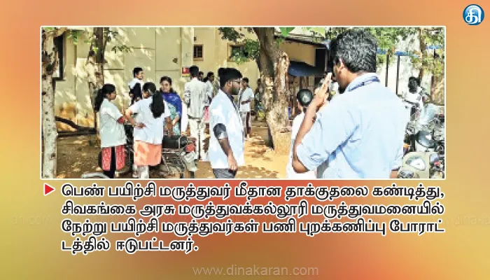 சிவகங்கை : சிவகங்கை அரசு மருத்துவக்கல்லூரி மருத்துவமனையில் 100 மாணவ, மாணவிகள் பயிற்சி மருத்துவர்களாக உள்ளனர். இவர்கள் அனைவரும் கல்லூரிக்கு பின்புறம் உள்ள விடுதியில் தங்கியுள்ளனர். நேற்று முன்தினம் இரவு 11 மணி அளவில் விடுதிக்குச் சென்ற பயிற்சி பெண் மருத்துவரை பின் தொடர்ந்து வந்த மர்ம நபர் ஒருவர் முகத்தில் துணியை போர்த்தி சரமாரியாக தாக்கியுள்ளார். சத்தம் கேட்டு சக மருத்துவ மாணவர்கள் ஓடி வந்தனர். உடனே மர்ம நபர் அங்கிருந்து தப்பியோடினார்.