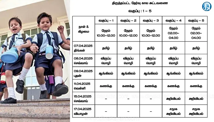 தொடக்கக் கல்வி இயக்கக நிர்வாகத்தின் கீழ் செயல்படும் பள்ளிகளில் ஒன்று முதல் ஐந்தாம் வகுப்பு வரை பயிலும் மாணவர்களுக்கு 09.04.2025 முதல் 21.04.2025 வரை மூன்றாம் பருவத் தேர்வு / ஆண்டு இறுதி தேர்வு நடைபெறும் என அறிவிக்கப்பட்டு இருந்தது. தமிழ்நாட்டில் வெயிலின் தாக்கம் தற்போது தீவிரமாக இருப்பதால் பல்வேறு தரப்பினரின் கோரிக்கைகள் மற்றும் பெற்றோர்களின் வேண்டுகோளை ஏற்று தமிழ்நாடு முதலமைச்சர் உத்தரவின்படியும் பள்ளிக் கல்வித் துறை அமைச்சர் வழிகாட்டுதல்களின்படியும் தேர்வுகள் முன்கூட்டியே தொடங்க திட்டமிடப்பட்டு உள்ளது.