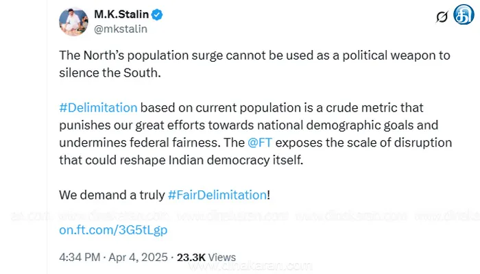 சென்னை: வடமாநில மக்கள்தொகை பெருக்கத்தை தென் மாநிலங்களை மவுனமாக்கும் அரசியல் ஆயுதமாக பயன்படுத்த கூடாது என லண்டனில் இருந்து வெளியாகும் பைனான்சியல் டைம்ஸ் கட்டுரையை சுட்டிக்காட்டி முதல்வர் மு.க.ஸ்டாலின் பதிவிட்டுள்ளார். தேசிய மக்கள்தொகை இலக்குகளை நோக்கிய முயற்சியை தண்டிக்கும் வகையில் இருக்கக் கூடாது. நியாயமான கூட்டாட்சியை குறைத்து மதிப்பிடும் வகையில் தொகுதி மறுவரையறை அமையக்கூடாது என்றும் கூறியுள்ளார்.