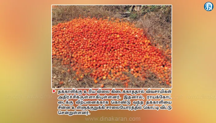 அதன்படி, கிலோ தக்காளி ₹10 கொள்முதல் செய்கின்றனர். அவற்றை வெளியூர்களுக்கு விற்பனைக்கு எடுத்துச் செல்கின்றனர். இரண்டாம் தர மற்றும் 3ம் தர தக்காளி கிரேடு ₹100ல் இருந்து ₹120வரையிலும் விற்பனையாகிறது. விலை வீழ்ச்சி காரணமாக விற்பனைக்காக கொண்டு வரும் தக்காளியை ராயக்கோட்டை சாலையோரங்களில் விவசாயிகள் கொட்டி விட்டு சென்றனர்.