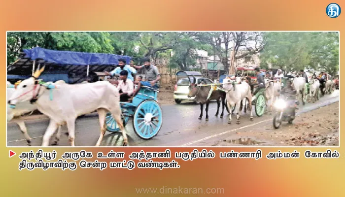 நாளை குண்டம் திருவிழா நடக்க உள்ள நிலையில் நேற்று அந்தியூர் அதன் சுற்றுவட்டார பகுதிகளிலிருந்து 50க்கும் மேற்பட்ட மாட்டு வண்டிகள் உடன் விவசாயிகள் அந்தியூரில் இருந்து அத்தாணி, சத்தியமங்கலம் வழியாக பண்ணாரி அம்மன் கோவிலுக்கு சென்றனர். ஒரே சமயத்தில் நீண்ட வரிசையில் தொடர்ந்து மாட்டுவண்டிகளாக செல்வதை ஊர் பொதுமக்கள் அதிசயமாக பார்த்தனர்.
