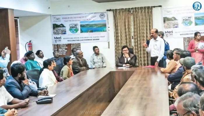 குன்னூர்: உலக சுற்றுச்சூழல் தினத்தை முன்னிட்டு குன்னூர் வெலிங்டன் பாளைய நிர்வாக அதிகாரி வினித் லோட் தலைமையில் பிளாஸ்டிக் பயன்பாட்டை முற்றிலுமாக போக்குவதற்கு கலந்தாய்வு கூட்டம் நடைபெற்றது.