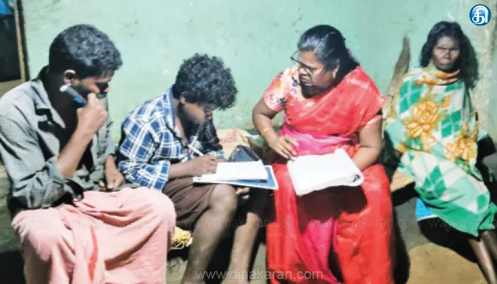 இதனைத்தொடர்ந்து நேற்று அந்த மாணவர்கள் கணித பாடத்திற்கான தேர்வு எழுதி உள்ளனர். ஆசிரியர் இரவு நேரத்தில் பழங்குடியின மாணவர்களின் வீடுகளுக்கு சென்று பாடம் நடத்துவதற்கு வசதியாக அவரது கணவர் வேலுச்சாமி உறுதுணையாக இருந்துள்ளார். பகல் நேரங்களில் மாணவர்களை தேடிச்சென்றால் அவர்கள் ஆசிரியரை பார்த்து ஓடி ஒளிந்து விடுகின்றனர்.