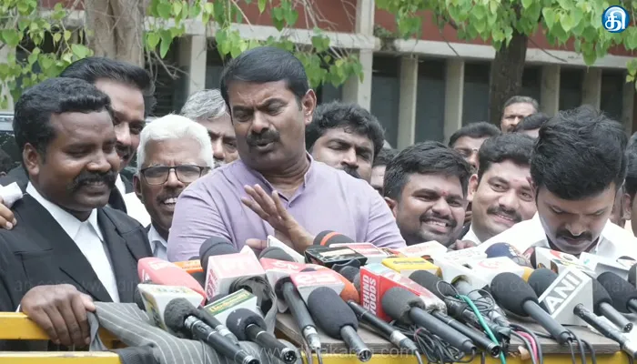 அப்போது சீமான் ஆஜராகவில்லை. டிஐஜி வருண்குமார் ஆஜரானார். சீமான் தரப்பில் ஆஜரான வக்கீல், சென்னையில் நடந்த ஒரு நிகழ்ச்சியில் சீமான் பங்கேற்றதால், அவர் ேகார்ட்டில் ஆஜராகவில்லை, எனவே சீமான் நாளை(இன்று) கோர்ட்டில் ஆஜராக அனுமதி அளிக்க வேண்டும் என்று கோரிக்கை வைத்தார். அதனை ஏற்ற நீதிபதி, சீமான் நாளை (இன்று) காலை 10.30 மணிக்கு ஆஜராக வேண்டும். இல்லை என்றால் பிடிவாரன்ட் பிறப்பிக்கப்படும் என்று உத்தரவிட்டு விசாரணையை ஒத்தி வைத்தார். அதன்படி இன்று காலை இந்த வழக்கு விசாரணைக்கு வந்தது. அப்ேபாது வக்கீலுடன் சீமான் காலை 10.30 மணிக்கு நீதிமன்றத்துக்கு வந்தார்.