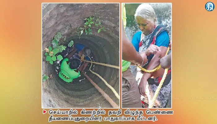 செய்யாறு : திருவண்ணாமலை மாவட்டம் செய்யாறு காந்தி சாலையை சேர்ந்தவர் வெங்கடேசன். இவரது மனைவி பாரதி(52). இவர் நேற்று அதிகாலை 5.30 மணியளவில் தனது வீட்டின் பின்புறமுள்ள 30 அடி ஆழமுள்ள தரைக்கிணற்றின் வழியாக நடந்து சென்றார்.அப்போது கால் தவறி கிணற்றில் விழுந்தார். உடனே அவர் சாதுரியமாக கிணற்றின் படிக்கட்டை பிடித்துக்கொண்டு தண்ணீரில் தத்தளித்தபடி கூச்சலிட்டார். ஆனால் யாருக்கும் கேட்கவில்லை.