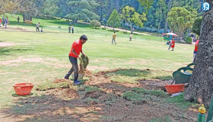 மேலும், சிறிய புல் மைதானத்திற்குள் மட்டுமே சுற்றுலா பயணிகள் செல்ல அனுமதிக்கப்பட்டுள்ளனர். அங்கு உள்ள மரங்களின் அடியில் உள்ள செடிகளில் பூக்கள் சேதம் அடைந்த நிலையில், அவைகளை அகற்றி விட்டு புதிய செடிகள் நடவு செய்யும் பணிகளும் தற்போது மேற்கொள்ளப்பட்டு வருகிறது. அதேபோல், மழையால் பாதிக்கப்பட்ட இடங்களில் சேதமான புற்களை அகற்றி விட்டு புதிய புற்கள் பதிக்கும் பணி துவக்கப்பட்டுள்ளது. மேலும் நாள்தோறும் புல் மைதானங்களுக்கு தண்ணீர் பாய்ச்சி சமன் செய்யும் பணிகளும் மேற்கொள்ளப்பட்டு வருகிறது.