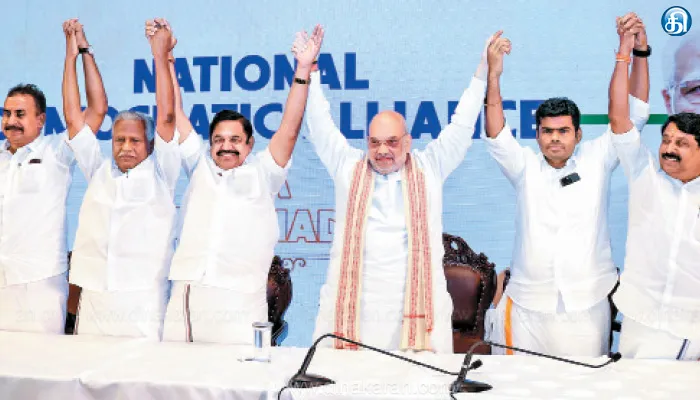 தேமுதிக, புதிய தமிழகம் கட்சிகளுடன் அதிமுக கூட்டணி வைத்தது. பாமக மற்றும் சிறிய கட்சிகளுடன் பாஜ கட்சி கூட்டணி வைத்தது. இரு அணிகளுமே தேர்தலில் கடும் தோல்வியை சந்தித்தனர்.இந்நிலையில் அதிமுகவுடன் மீண்டும் கூட்டணி வைக்க பாஜ முயன்றது. ஆனால் 2026 சட்டப்பேரவை தேர்தலில் பாஜவுடன் கூட்டணி இல்லை என்று எடப்பாடி தொடர்ந்து கூறிவந்தார். ஆனால் கடந்த மாதம் திடீரென்று அமித்ஷா அழைப்பின் பேரில் டெல்லி சென்ற எடப்பாடி, யாரையும் சந்திக்க வரவில்லை என்றார். பின்னர் 3 காரில் மாறி மாறிச் சென்று ரகசியமாக அமித்ஷாவை சந்தித்தார்.