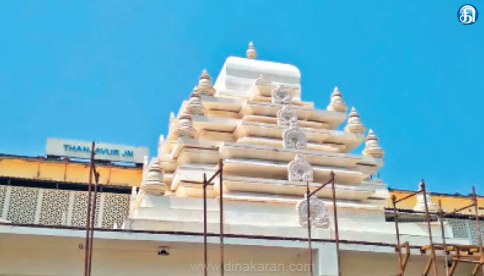 தஞ்சாவூர்: நாட்டில் உள்ள பல்வேறு ரயில் நிலையங்களை நவீன வசதிகளுடன் ஒன்றிய அரசு புதுப்பித்து வருகிறது. அவ்வாறு புதுப்பிக்கும்போது அந்த ஊரில் சிறப்பை ரயில் நிலைய முகப்பில் அமைத்து வருகின்றனர். அதன்படி தஞ்சாவூர் ரயில் நிலையம் புதுப்பிக்கப்பட்டு வருகிறது. இந்த ரயில் நிலைய நுழைவாயில் முகப்பில் இருந்த உலகப் புகழ் பெற்ற தஞ்சாவூர் பெரிய கோயில் இருந்த இடத்தில் தற்போது வடநாட்டு மந்திர் கோயில் இடம் பெற்றுள்ளது சர்ச்சையை ஏற்படுத்தி உள்ளது. இதற்கு ஒன்றிய அரசுக்கு உலகத் தமிழர் பேரமைப்பு கண்டனம் தெரிவித்துள்ளது.