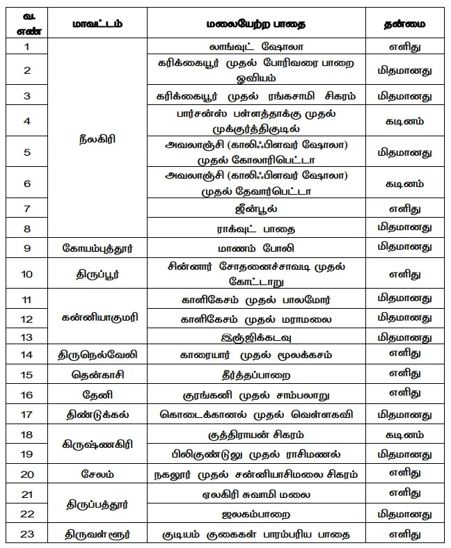 சென்னை: வனத்தீ பருவகாலம் முடிவுறும் நிலையில் இன்று முதல் மலையேற்றத்துக்கான 23 தடங்கள் திறக்கப்படுகிறது. பாதைகள் எளிதானது முதல் மிதமான சிரமம் கொண்டவைகளாக முதன்மைப்படுத்தப்பட்டுள்ளதாக வனத்துறையினர் தெரிவித்துள்ளனர். அனைத்து வயதினருக்கும் ஏற்றவாறு பாதுகாப்பான மற்றும் கல்வி சார்ந்த அனுபவத்தை வழங்குமாறு அமைக்கப்பட்டுள்ளது.