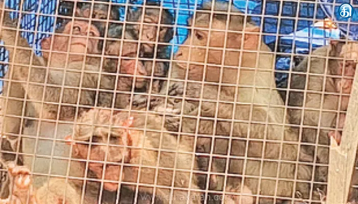 சிறிதுநேரம் கழித்து அப்பகுதியில் சுற்றி திரிந்த குரங்குகள் ஒவ்வொன்றாக தின்பண்டங்களுக்கு ஆசைப்பட்டு கூண்டுக்குள் வரிசையாக நுழைந்து அதனை சாப்பிட துவங்கின. இதையடுத்து சிறிதுநேரம் காத்திருந்த வனத்துறையினர் கூண்டின் கதவை லாவகமாக மூடினர். இதில் மொத்தம் 25 குரங்குகள் சிக்கி கொண்டது. பிடிபட்ட இந்த குரங்குகள் வனப்பகுதியில் விடப்படும் என வனத்துறையினர் தெரிவித்தனர்.