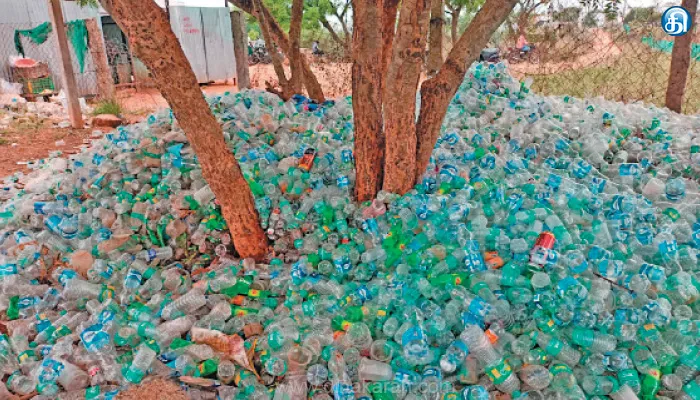 இந்நிலையில், கருர்- திண்டுக்கல் சாலை பத்தாம்பட்டி பகுதியில் செயல்படும் டாஸ்மாக் கடையை ஒட்டி சேகரிக்கப்படும் பிளாஸ்டிக் வாட்டர் பாட்டில்கள் அனைத்தும் ஒரு மரத்தின் அடியில் மொத்தமாக கொட்டி வைக்கப்பட்டுள்ளது.