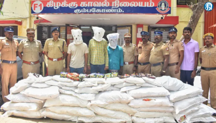 இதையடுத்து மூவரையும் கைது செய்த போலீசார் அவர்கள் கடத்தி வந்த புகையிலை பொருட்கள் மற்றும் கடத்தலுக்கு பயன்படுத்தப்பட்ட சொகுசு கார் உள்ளிட்டவற்றை பறிமுதல் செய்து கும்பகோணம் கிழக்கு போலீஸ் நிலையத்திற்கு கொண்டு வந்தனர்.