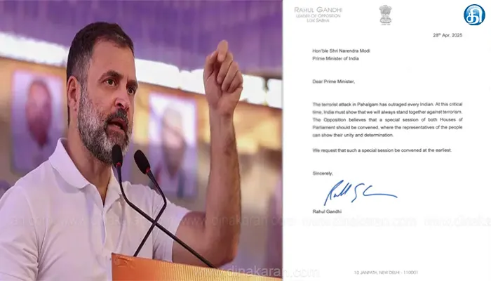 இந்நிலையில், காஷ்மீரில் தீவிரவாத தாக்குதல் நடந்தது தொடர்பாக விவாதம் நடத்த நாடாளுமன்ற சிறப்புக் கூட்டத்தை கூட்ட பிரதமர் நரேந்திர மோடிக்கும் மக்களவை எதிர்க்கட்சித் தலைவர் ராகுல் காந்தி கடிதம் அனுப்பியுள்ளார். அந்த கடிதத்தில், காஷ்மீரில் நடந்த தீவிரவாத தாக்குதல் ஒவ்வொரு இந்தியருக்கும் கொந்தளிப்பை ஏற்படுத்தியுள்ளது. தீவிரவாதத்துக்கு எதிராக இந்தியாவில் அனைவரும் ஒன்றிணைந்து இருப்பதை காட்ட வேண்டும். நாடாளுமன்ற இரு அவைகளின் சிறப்புக் கூட்டத்தை ஒன்றிய அரசு கூட்டும் என்று எதிர்க்கட்சிகள் நம்பிக்கை கொண்டுள்ளது. அந்த கூட்டத்தில் நாடாளுமன்றத்தில் மக்கள் பிரதிநிதிகள் அவர்களது ஒற்றுமையையும், ஸ்திரத்தன்மையையும் காட்டுவர் என ராகுல் காந்தி கோரிக்கை விடுத்துள்ளார்.