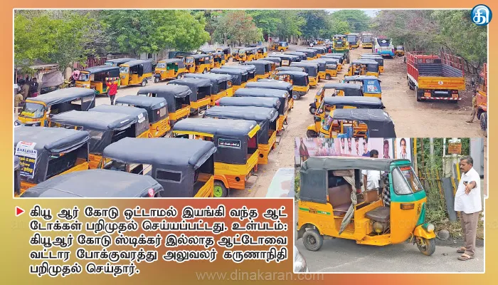 அப்போது, கியூஆர் கோடு இல்லாத 20க்கும் மேற்பட்ட ஆட்டோக்கள் பறிமுதல் செய்யப்பட்டன. பின்னர், சம்மந்தப்பட்ட ஆட்டோக்களின் ஆவணங்கள் ஆய்வு செய்யப்பட்டு, கியூஆர் கோடு வழங்கப்பட்டது. உரிய ஆவணங்கள் இல்லாத ஆட்டோக்கள், வட்டார போக்குவரத்து அலுவலகத்துக்கு கொண்டுசெல்லப்பட்டன.