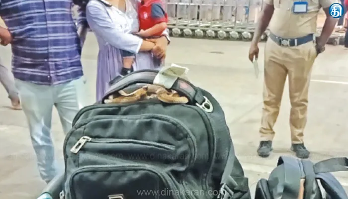 சூட்கேஸின் கைப்பிடியில் பாம்பு ஒன்று சுற்றிக்கொண்டு இருந்தது. உடனடியாக சதீஷின் குடும்பத்தினர் மற்றும் அங்கு நின்ற சக பயணிகள் பாம்பு என்று கூச்சல் போட்டனர். உடனடியாக அங்கு நின்ற போலீசார், வனத்துறையினருக்கும், தீயணைப்பு துறைக்கும் தகவல் தெரிவித்தனர். இதற்கிடையே அந்த பாம்பு கொடிய விஷம் உடைய நல்ல பாம்பு என்றும், கண்ணாடி விரியன் என்றும் பயணிகள் பலர் கூறியதால், சதீஷ் குடும்பத்தினர் மேலும் அச்சம் அடைந்தனர்.