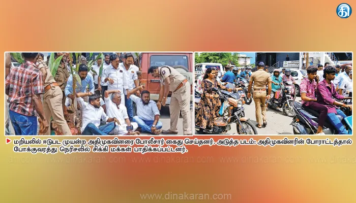 உரிய அனுமதியின்றி போக்குவரத்து நிறைந்த சாலையில் கையில் தென்னங்கன்றுடன் நாற்று நடும் போராட்டத்திற்கு செல்ல முயன்றனர். அவர்களை மேட்டுப்பாளையம் டிஎஸ்பி (பொறுப்பு) பொன்னுச்சாமி, இன்ஸ்பெக்டர் சின்னக்காமனன் தலைமையிலான போலீசார் தடுத்து நிறுத்தி பேச்சுவார்த்தையில் ஈடுபட்டனர். அப்போது, தடையை மீறி திடீரென சாலையின் நடுவே அமர்ந்து அதிமுகவினர் மறியலில் ஈடுபட முயன்றனர். போலீசாருக்கும், போராட்டக்காரர்களுக்கும் இடையே கடும் தள்ளுமுள்ளு ஏற்பட்டது.