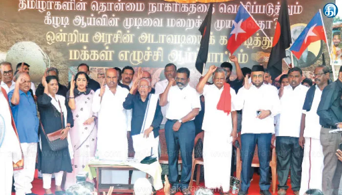 * திருமாவளவன் பேசுகையில், ‘‘கீழடி ஆய்வு தொடர்பான அறிக்கையினை ஒன்றிய அரசு திருப்பி அனுப்பி உள்ளது. தமிழர்களின் தொன்மையே இந்தியர்களின் வரலாறு என்பதை அவர்களால் ஏற்றுகொள்ள முடியவில்லை” என்று கூறினார்.