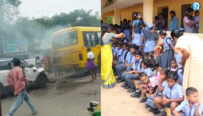 அப்போது வேன் குலுங்கியதில் பள்ளி மாணவர்கள் முன்னால் உள்ள சீட்டிலும், கம்பியிலும் மோதி லேசான காயமடைந்தனர். இந்த விபத்தில் காரில் இருந்து புகை வந்ததை கண்ட கார் ஓட்டுநர் உடனடியாக காரில் இருந்து இறங்கினார். அப்போது காரின் முன் பகுதியில் தீப்பற்றி வேனிற்கும் தீ பரவியது. இதனையடுத்து வேனில் இருந்த பள்ளி மாணவர்கள் அனைவரும் அலறியடித்தபடி வேனில் இருந்து இறங்கி பாதுகாப்பாக அப்புறப்படுத்தப்பட்டு அருகில் இருந்த அரசு பள்ளி வளாகத்திற்குள் அழைத்து செல்லப்பட்டனர். கார், வேன் தீப்பற்றியதை கண்ட அப்பகுதி மக்கள் மற்றும் கடை உரிமையாளர்கள் துரிதமாக செயல்பட்டு தண்ணீரை ஊற்றி தீயை அணைத்தனர்.
