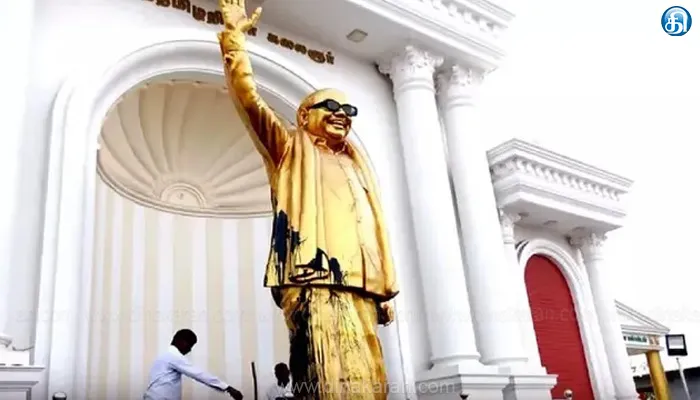 மின் இணைப்பை துண்டித்த அந்த நபர், அங்கிருந்த 5 அடி நீள குச்சியின் ஒரு பகுதியில் துணியை கட்டி, அதன்மூலம் பெயின்டை எடுத்து கலைஞரின் சிலை மீது பூசியுள்ளார். பின்னர், சிலையின் கீழே உள்ள பீடத்திலும், பரவலாக பெயின்ட்டை ஊற்றிவிட்டு சென்றுள்ளார். அந்த நபர் குறித்து போலீசார் விசாரித்து வருகின்றனர்.