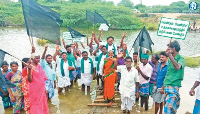 இதை அறிந்த உத்தமசோழபுரம் பகுதியை சேர்ந்த விவசாயிகள், பாஜ மாநில தலைவர் நயினார் நாகேந்திரன் நாகப்பட்டினம் மாவட்டத்தை விட்டு உடனே வெளியேற வேண்டும். உத்தமசோழபுரத்தில் தடுப்பணை கட்ட வேண்டும் என கோஷங்கள் எழுப்பி உத்தமசோழபுரத்தில் அணை கட்டும் இடத்தில் வெட்டாற்றில் கருப்பு கொடியுடன் இறங்கி போராட்டம் நடத்தினர்.