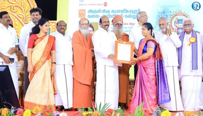 தமிழ்நாடு முதலமைச்சர் மு.க. ஸ்டாலின் சீர்மிகு வழிகாட்டுதலின்படி, பொதுப்பணிகள், நெடுஞ்சாலைகள் மற்றும் சிறுதுறைமுகங்கள் துறை அமைச்சர் எ.வ.வேலு இன்று (21.07.2025) சென்னை, கொளத்தூர், அருள்மிகு கபாலீசுவரர் கலை மற்றும் அறிவியல் கல்லூரியில் நடைபெற்ற ஐந்தாம் ஆண்டு தொடக்க விழாவில் அக்கல்லூரியில் பயிலும் 762 மாணவ, மாணவியருக்கு கல்விக் கட்டணம் ரூ.10,000/- மற்றும் கல்வி உபகரணங்களுடன் கூடிய புத்தகப் பைகளையும், அக்கல்லூரிக்கு புதிதாக தேர்வு செய்யப்பட்டுள்ள 11 உதவிப் பேராசிரியர்கள் மற்றும் ஒரு கண்காணிப்பாளருக்கு பணி நியமன ஆணைகளையும் வழங்கினார்.