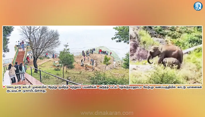 கோத்தகிரி : கொடநாடு காட்சி முனையின் கீழ் பகுதியில் குட்டியுடன் காட்டுயானைகள் முகாமிட்டுள்ளதால் சுற்றுலா பயணிகள் ரெட்டிப்பு மகிழ்ச்சியடைந்துள்ளனர்.