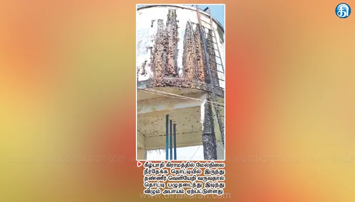 தஞ்சாவூர் : தஞ்சை அருகே அம்மாபேட்டை ஒன்றியத்திற்க்கு உட்பட்ட புலவர் நத்தம் கிராம ஊராட்சி கீழ்பாதி கிராமத்தில் மேல்நிலை நீர்தேக்க தொட்டியில் இருந்து தண்ணீர் வெளியேறி வருவதால் தொட்டி பழுதடைந்து இடிந்து விழும் அபாயம் ஏற்பட்டுள்ளது.