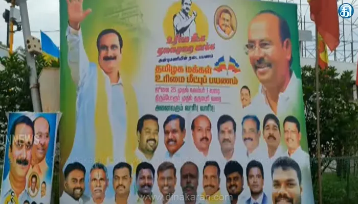 ராமதாஸ், அன்புமணி, சௌமியா அன்புமணி உள்ளிட்டோர் புகைப்படங்கள் மட்டுமே இடம்பெற்று உள்ளது. பேனர்களில் பாமக கவுரவ தலைவர் ஜி.கே.மணி, ஏ.கே.மூர்த்தி உள்ளிட்டோரின் படங்கள் இடம் பெறவில்லை. தமிழக மக்கள் உரிமை மீட்பு பயணத்தை ஒட்டி பேனர்கள், பாமக கொடிகள் வைக்கப்பட்டுள்ளன. கட்சியின் கொடியை பயன்படுத்தக் கூடாது என ராமதாஸ் நேற்று கூறியிருந்த நிலையில் கட்சி கொடிகள் நடப்பட்டுள்ளன. அன்புமணியின் நடைப் பயணத்தால் சட்டம் ஒழுங்கு பிரச்சினை ஏற்படும் என டிஜிபியிடம் ராமதாஸ் புகார் அளித்திருந்தார்.