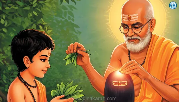 கொல்லைப்புறத்தில் ஏதோ வேலையில் இருந்த அதிகாரி, முந்தின தினம் வில்வக் கூடையைச் சுமந்து வந்த ஸ்ரீ மடத்து இளைஞனிடம் கேட்டார்; “ஏண்டாப்பா… இன்னிக்கும் நெறய வில்வம் வேணுமே! நீ கைராசிக்காரனா இருக்கே! இன்னிக்கும் பந்தக்கால்கிட்ட யாராவது வில்வம் கொண்டு வந்து வெச்சுட்டுப் போயிருக்காளானு பாரேன்!” உடனே வாசலுக்கு ஓடினான் இளைஞன். என்ன ஆச்சரியம்! முந்தைய நாள் போலவே ஒரு பெரிய ஓலைக் கூடை நிறைய வில்வதளம்! இளைஞனுக்கு சந்தோஷம்.