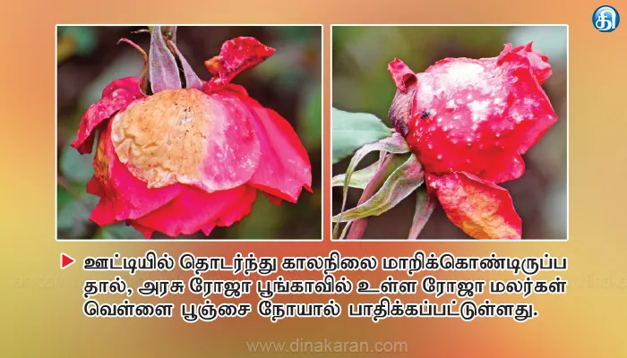 ரோஜா பூங்காவில் தற்போது பல வண்ண வண்ண மலர்கள் பூத்து குலுங்குகின்றன. இந்நிலையில் கடந்த ஒரு வாரத்திற்கும் மேலாக காற்று மற்றும் மேகமூட்டத்துடன் லேசான மழை பெய்து வருகிறது. இந்த மாறுபட்ட காலநிலைகளால் ரோஜா மொட்டுகள் மற்றும் மலர்களில் பூஞ்சை தொற்று ஏற்பட்டு வெள்ளை நிறத்தில் பாதித்து வாடியுள்ளன. வெயிலான காலநிலை நிலவும் பட்சத்தில் சரியாக வாய்ப்புள்ளது என அதிகாரிகள் தெரிவித்துள்ளனர்.