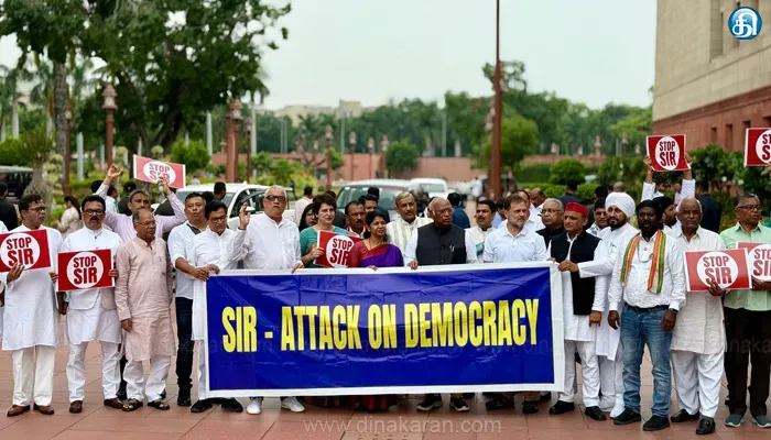 இதில், காங்கிரஸ் தலைவர் மல்லிகார்ஜூன கார்கே, சோனியா காந்தி, ராகுல் காந்தி, பிரியங்கா காந்தி, திமுக எம்பிக்கள் கனிமொழி, ஆ.ராசா உள்ளிட்டோர் பங்கேற்று, பீகார் வாக்காளர் பட்டியல் திருத்தத்திற்கு எதிராக பிரமாண்டமான பேனர் ஏந்தி கோஷமிட்டனர். அந்த பேனரில் ‘சிறப்பு திருத்தம் (எஸ்ஐஆர்) ஜனநாயகத்தின் மீதான தாக்குதல்’ என்ற வாசகம் எழுதப்பட்டிருந்தது. உடனடியாக தீவிர திருத்தத்தை நிறுத்த வேண்டுமென எழுதப்பட்ட பதாகைகள் ஏந்தி எம்பிக்கள் கோஷமிட்டனர்.