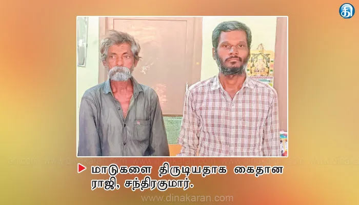 பின்னர், பிடிபட்ட இருவரையும் திமிரி காவல் நிலையம் அழைத்து வந்து தீவிர விசாரணை நடத்தினர். அதில், அவர்கள் திருவண்ணாமலை மாவட்டம், ஆரணி வீராசாமி தெருவை சேர்ந்த ராமன் மகன் ராஜி(43), ஆரணிபாளையம் சத்யா நகரை சேர்ந்த அப்பாதுரை மகன் சந்திரகுமார்(65) என்பதும் மாடுகளை விற்பனை செய்வதற்காக நோட்டமிட்டு திருடிச்சென்றதும் தெரியவந்தது.