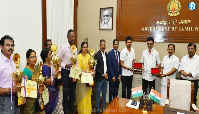சென்னை: தமிழ்நாட்டிலுள்ள 5 கூட்டுறவு சர்க்கரை ஆலைகளுக்கு வழங்கப்பட்ட விருதுகளை முதல்வரிடன் காண்பித்து அமைச்சர் ராஜேந்திரன் வாழ்த்து பெற்றார். இது குறித்து வெளியிடப்பட்டுள்ள அறிக்கையில், முதலமைச்சர் மு.க. ஸ்டாலின் இன்று (1.8.2025) தலைமைச் செயலகத்தில், சுற்றுலா மற்றும் சர்க்கரைத்துறை அமைச்சர் இராஜேந்திரன் சந்தித்து, தமிழ்நாட்டிலுள்ள 5 கூட்டுறவு சர்க்கரை ஆலைகளுக்கு புதுடெல்லியில் 3.7.2025 அன்று நடைபெற்ற விழாவில் தேசிய கூட்டுறவு சர்க்கரை ஆலைகளின் சம்மேளனத்தால் வழங்கப்பட்ட விருதுகளை காண்பித்து வாழ்த்துப் பெற்று. கள்ளக்குறிச்சி-2 மற்றும் அரூர். சுப்ரமணிய சிவா கூட்டுறவு சர்க்கரை ஆலைகளில் இலாப பங்கீட்டு ஈவுத்தொகையாக 22 கோடியே 60 லட்சம் ரூபாய்க்கான காசோலைகளை வழங்கினார்.