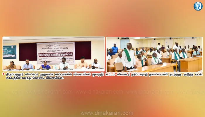 திருப்பத்தூர் கலெக்டர் அலுவலக கூட்டரங்கில் விவசாயிகளுக்கான மாதாந்திர குறைதீர்வு கூட்டம் நேற்று நடைபெற்றது. கூட்டத்திற்கு கலெக்டர் க.தர்ப்பகராஜ் தலைமை தாங்கினார். மாவட்ட வருவாய் அலுவலர் நாராயணன், வேளாண்மை இணை இயக்குனர் கண்ணகி ஆகியோர் முன்னிலை வகித்தனர். இதில் மாவட்டம் முழுவதும் உள்ள பல்வேறு பகுதிகளில் இருந்து விவசாயிகள் பலர் கலந்து கொண்டனர்.