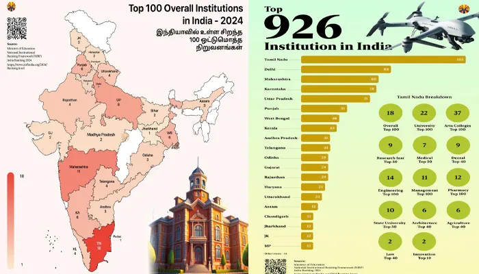 சட்டக்கல்லூரிகள் – 2 புதுமையான நிறுவனங்கள் – 2 ஆகியவை தேசிய கல்வி நிறுவன தரவரிசைப் பட்டியலில் இடம்பிடித்துள்ளன. 926 கல்லூரிகளில் 165 தமிழ்நாட்டைச் சேர்ந்தவை.