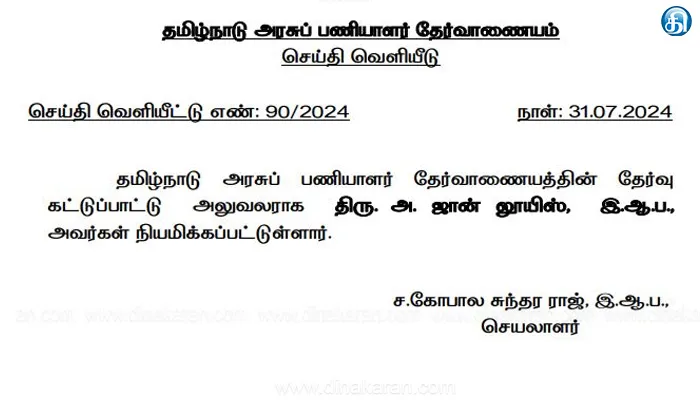 The post டிஎன்பிஎஸ்சி தேர்வு கட்டுப்பாட்டு அலுவலராக ஜான் லூயிஸ் நியமனம் appeared first on Dinakaran.